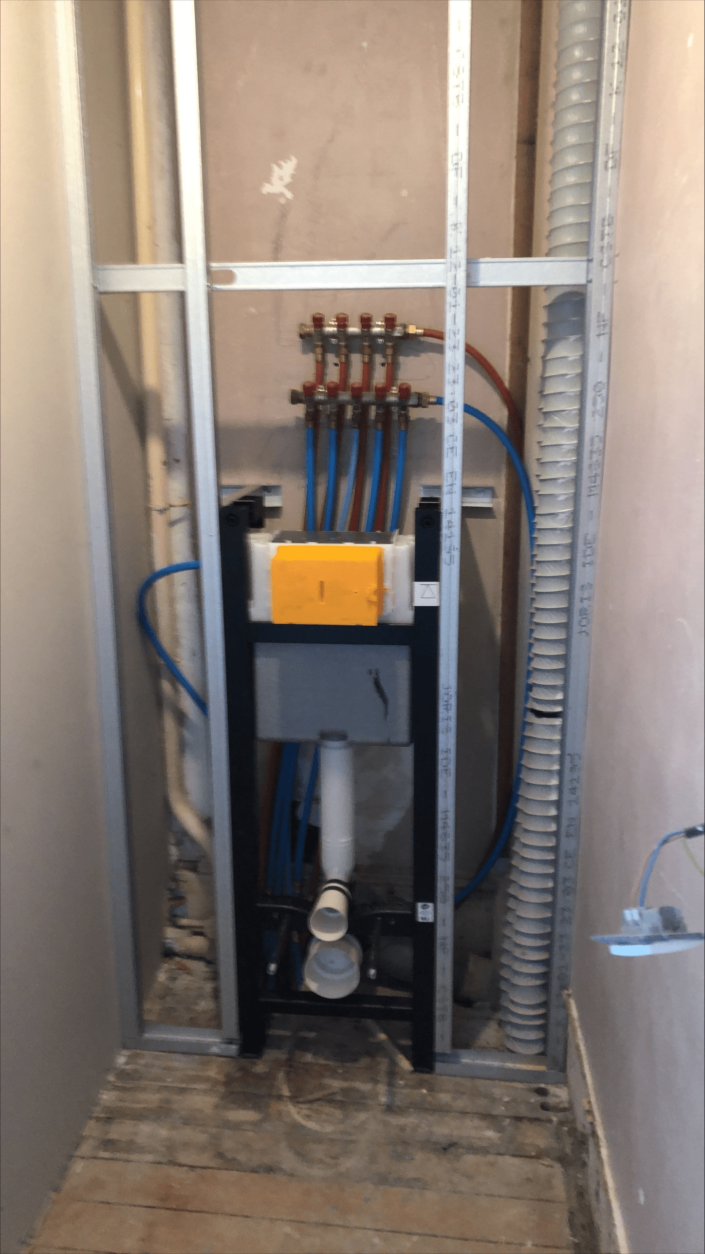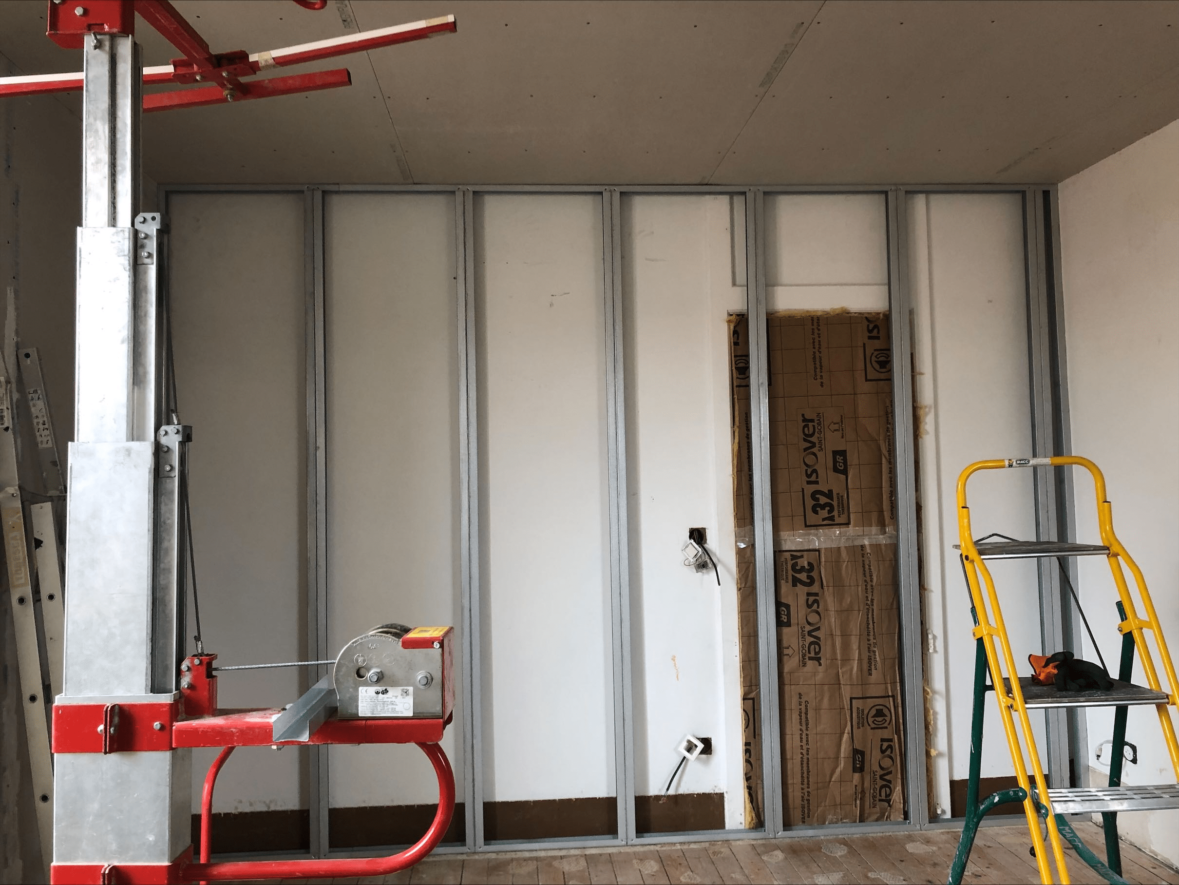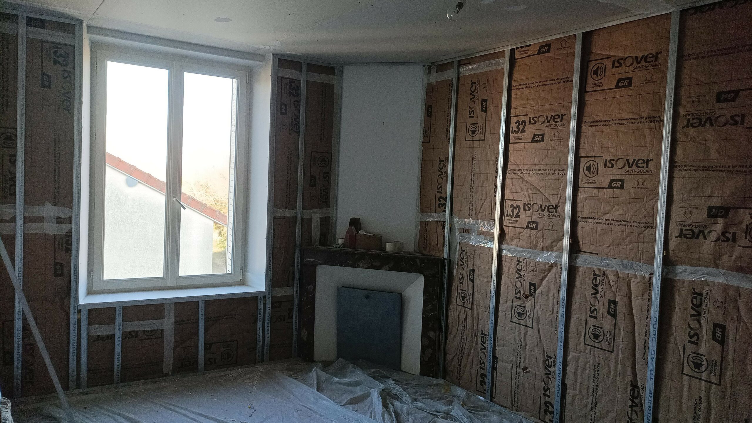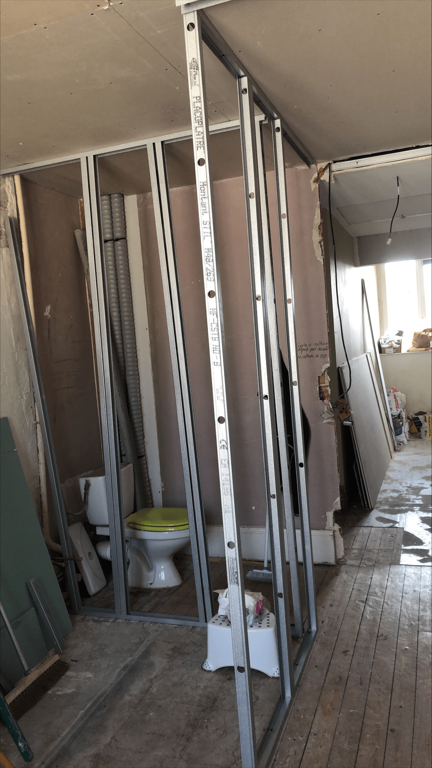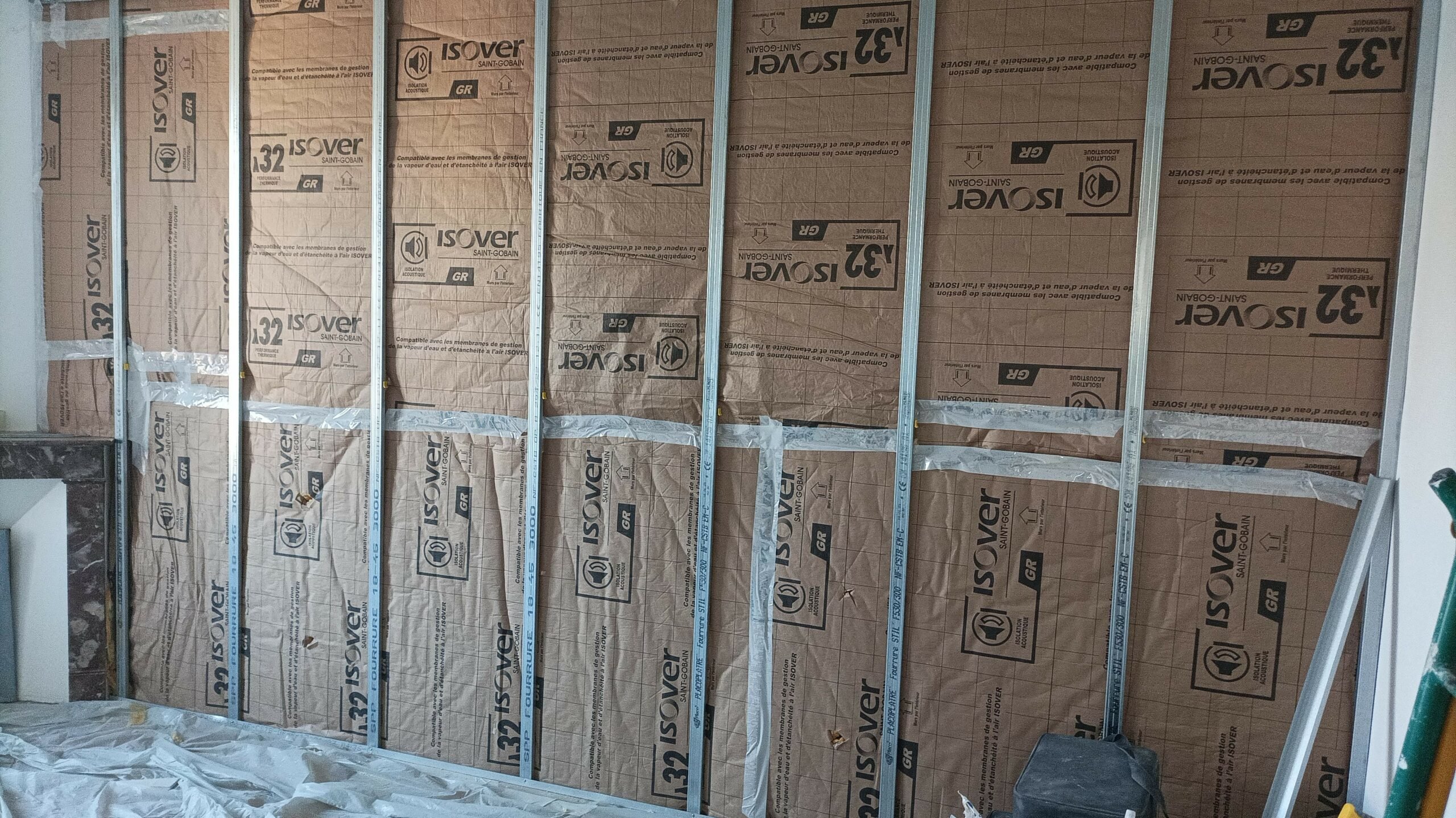 Placage et isolation de murs existants, création de nouvelles cloisons avec portes, pose d’un WC suspendu et d’une baignoire.